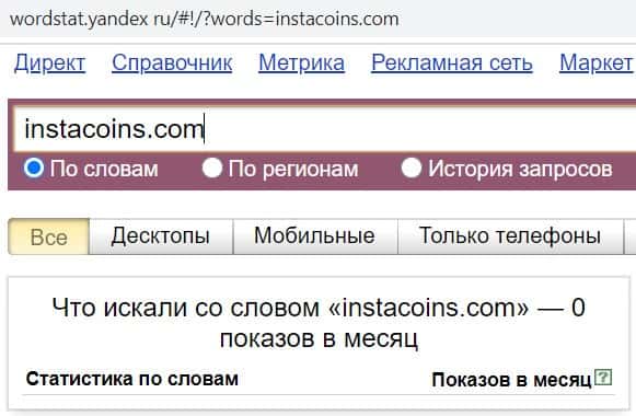 В поисковой системе Яндекс доменное имя сайта "instacoins.com", вбитый в строку с точкой, пользователи не искали ни разу за месяц.