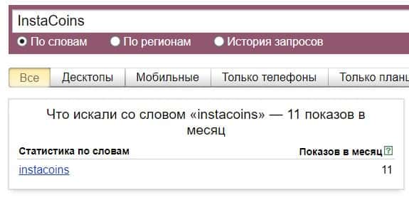 То же название на русском языке, но с пробелом "Инста Коинс", пользователи не вбивали в поисковую строку в системе Гугл.