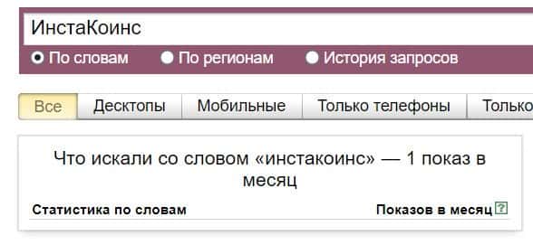 Название бренда на русском языке без пробела "ИнстаКоинс", пользователи искали в системе Яндекс всего один раз.