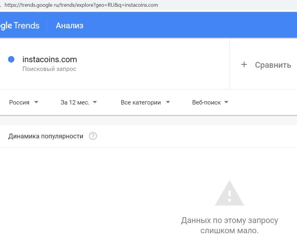 Доменное имя мошеннического сайта "instacoins.com" пользователи вбивали в поисковую систему Гугл слишком редко, поэтому данных по этому запросу очень мало.