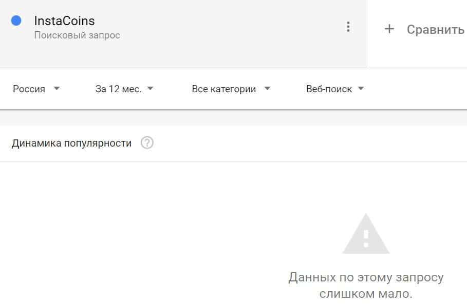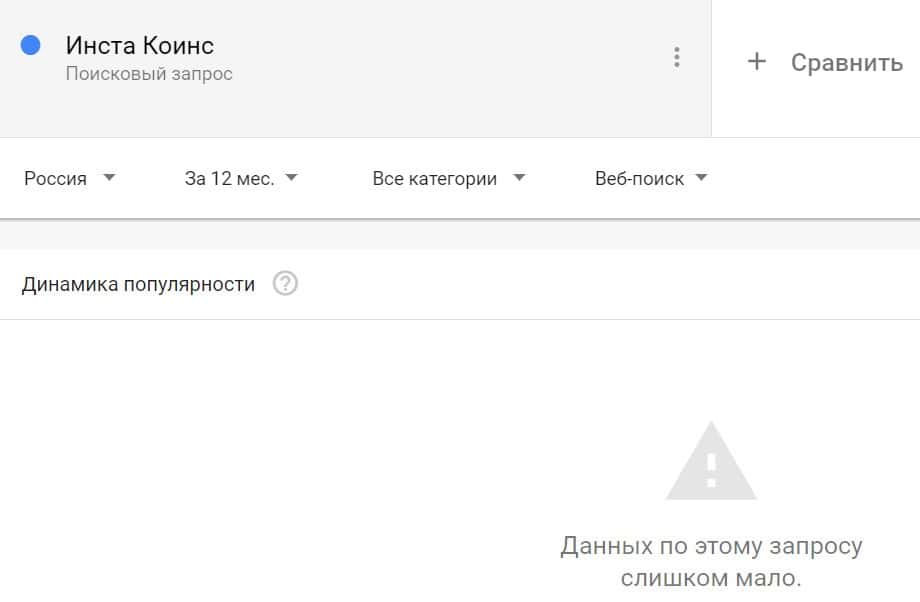 Посмотрим, насколько популярно название бренда "InstaCoins", написанное на английском языке. Данных по этому запросу нет, так как никто не искал этот бренд в Гугл.