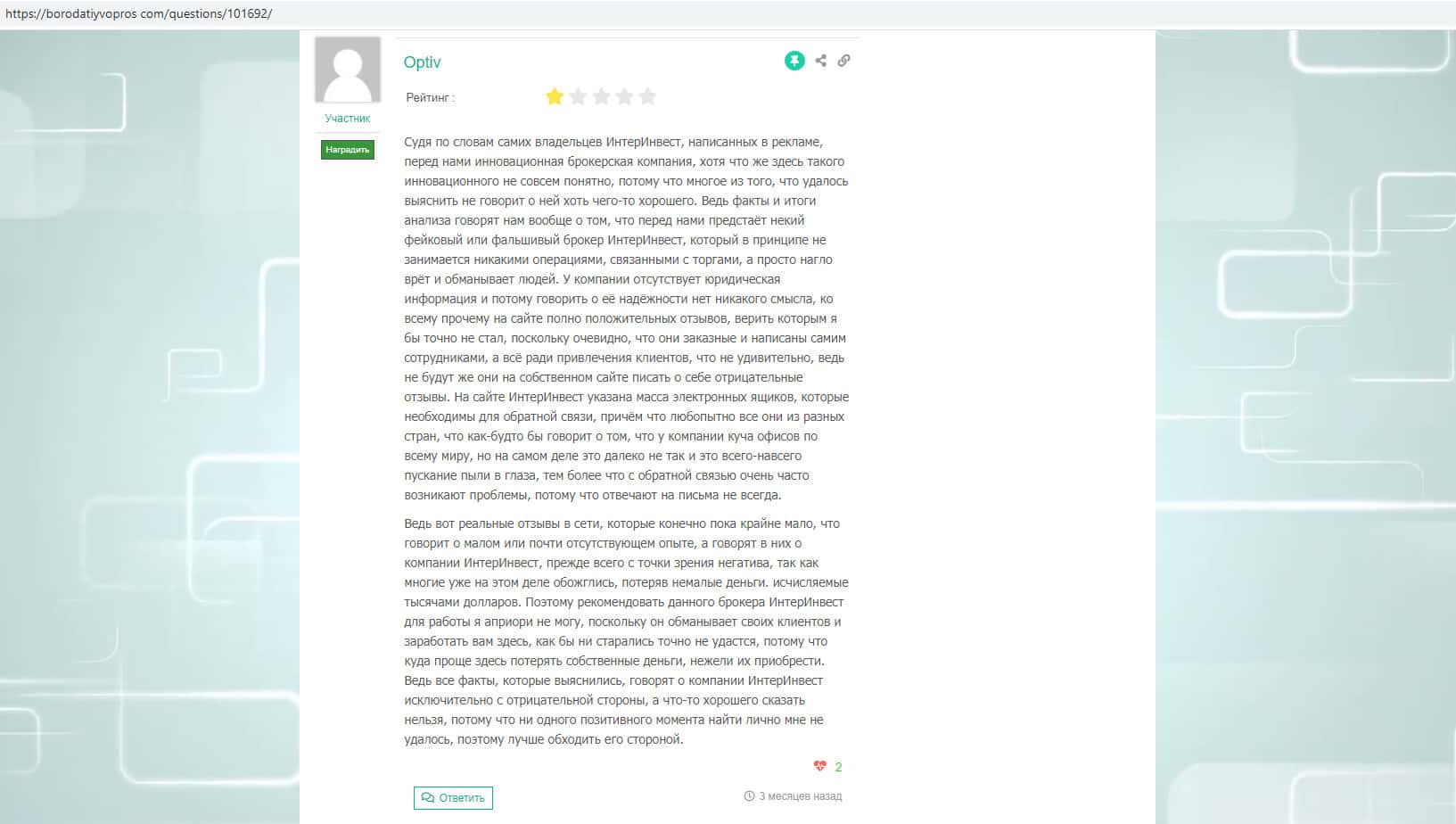 Пользователь Optiv оставил отзыв, в котором говорится, что перед нами предстаёт некий фейковый или фальшивый брокер ИнтерИнвест, который в принципе не занимается никакими операциями, связанными с торгами, а просто нагло врёт и обманывает людей, а у компании отсутствует юридическая информация и потому говорить о её надёжности нет никакого смысла.