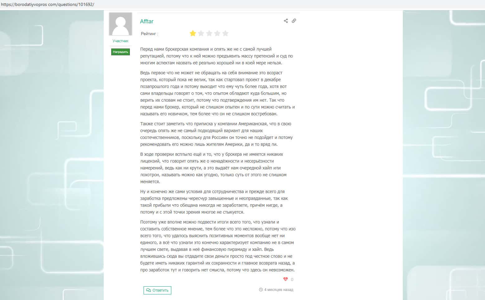 Afftar написал отзыв, в котором он приходит к выводу, что "Ведь вложившись сюда вы отдадите свои деньги просто под честное слово и не будете иметь никаких гарантий их сохранности и главное возврата назад, а про заработок тут и говорить нет смысла, потому что здесь он невозможен."