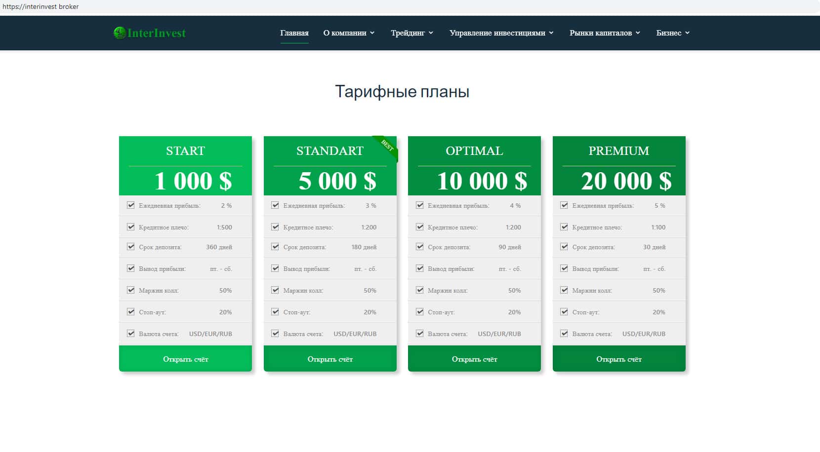 У Интер Инвест есть 4 пакета для своих клиентов, у каждого пакета разные условия и стартовая цена тоже. К примеру, если вы ходите начать с минимальной суммы и на долгосрочную инвестицию, то для вас придуман тарифный план START: депозит составляет 1000 долларов на 360 дней, а в противовес имеется тарифный план Premium.