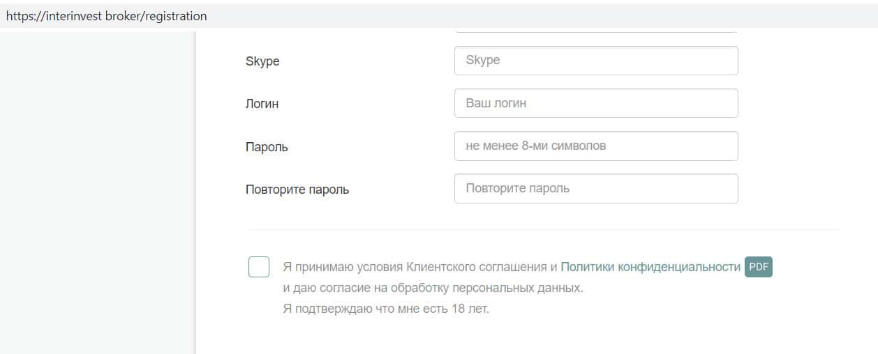 При попытке зарегистрироваться на портале мошенников Интер Инвест Брокер мы должны согласиться с политикой конфиденциальности и клиентским соглашением, но при этом самого клиентского соглашения найти мы не можем по причине его отсутствия, таким образом, все свои мошеннические действия Интер Инвест могут сводить на клиентское соглашение, которого нет.