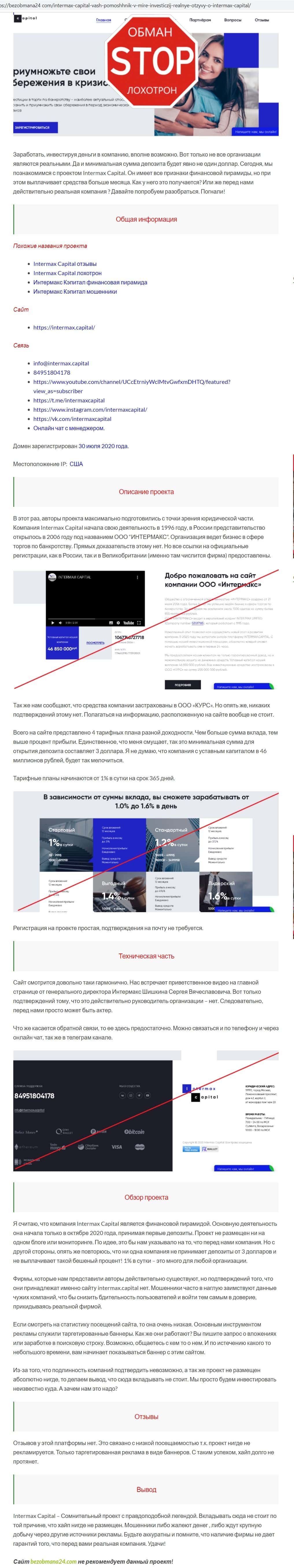 Авторы статьи с сайта bezobmana24 com считают, что проект Интер Макс Капитал больше всего похож на финансовую пирамиду, поэтому связываться с ним не надо.