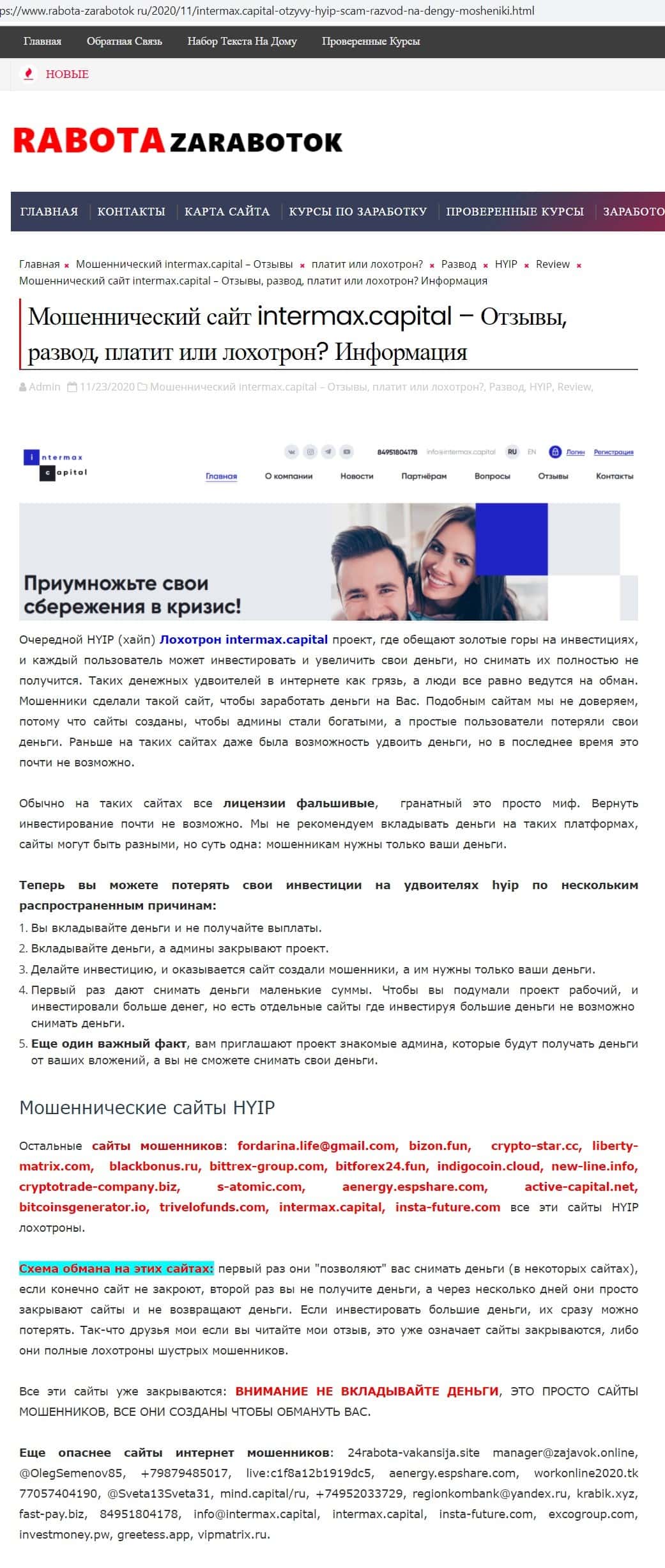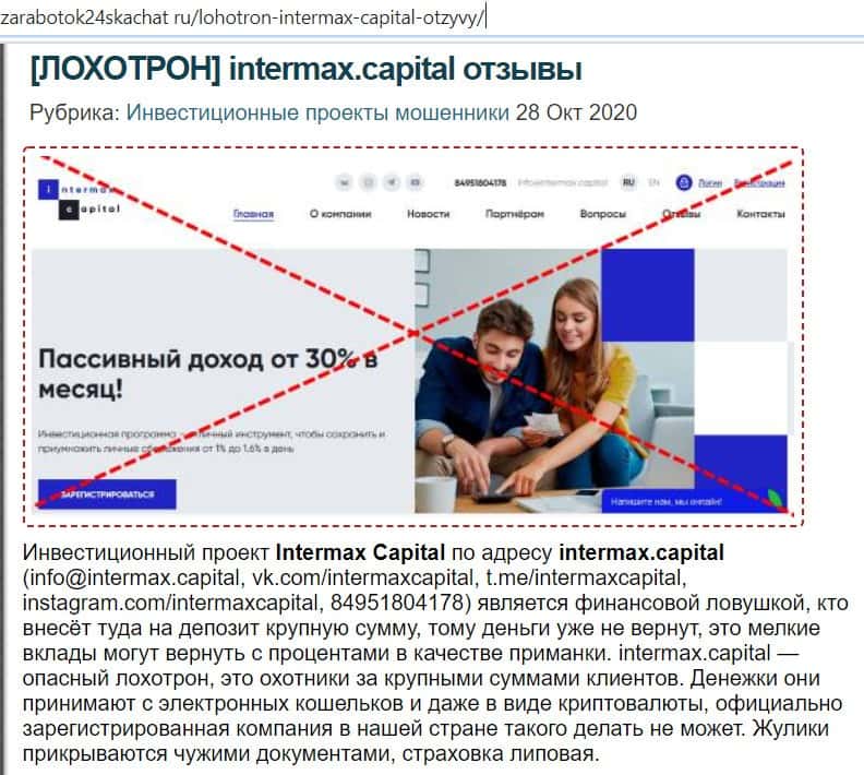На сайте rabota-zarabotok ru описаны схемы мошенничества, к которым прибегают аферисты Интер Макс Капитал. Редакция сайта не советует вкладывать средства в проект.