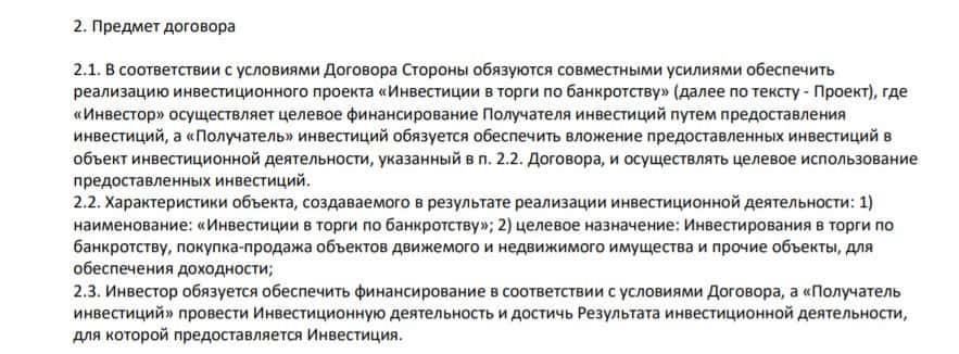 Во втором разделе компании InterMax Capital описывается предмет договора, которым является финансирование в торги по банкротству организаций.
