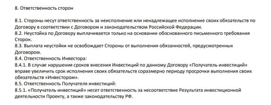 Восьмой раздел договора компании Интер Макс Капитал рассказывает об ответственности сторон. Они должны соблюдать все условия настоящего соглашения.