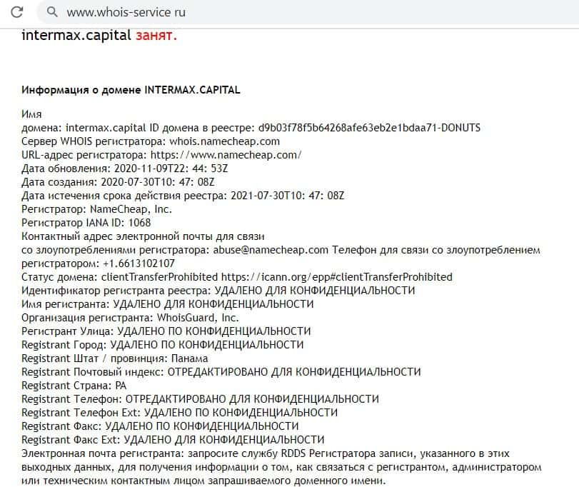 Сервис проверки сайтов Войссервис показывает, что вся информация о создателях ресурса с доменом intermax capital скрыта от пользователей, это аферисты.
