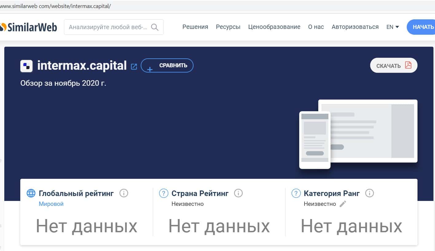 Сервис Симиларвеб не располагает данными о домене intermax capital, это означает, что контора новая и никто не знает о ее существовании.