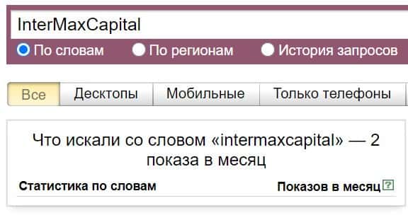 Примерно такая же ситуация возникла с поисковым запросом на бренд "InterMaxCapital", написанный на английском языке. Почти никто не делал попытки найти эту контору.