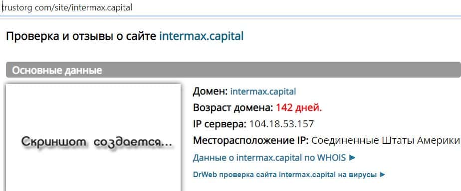 Возраст доменного имени сайта intermax capital, по данным Трасторг, составляет 142 дня. Компания создана несколько месяцев назад, поэтому ни о каком доверии к ней нет и речи.