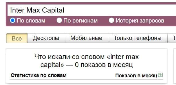 Название бренда, написанное на английском языке с пробелами "Inter Max Capital", люди вбивали в поисковую систему Гугл довольно редко.