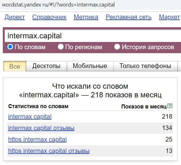 В поисковой системе Яндекс сайт инвестиционной компании "intermax.capital", вбитый в строку с точкой, пользователи искали всего 218 раз.
