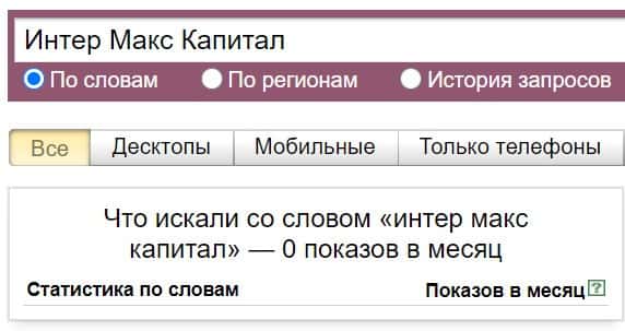 Название бренда на русском языке без пробела "ИнтерМаксКапитал", пользователи не искали в системе Яндекс на разу.