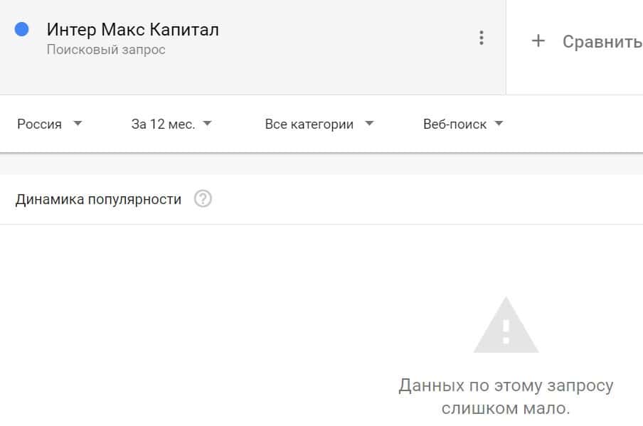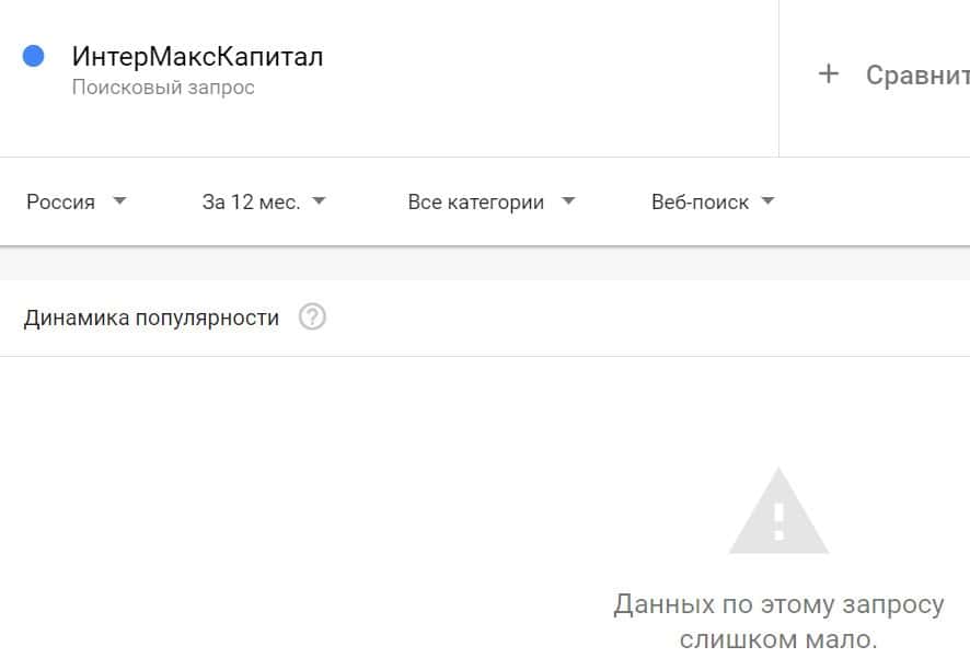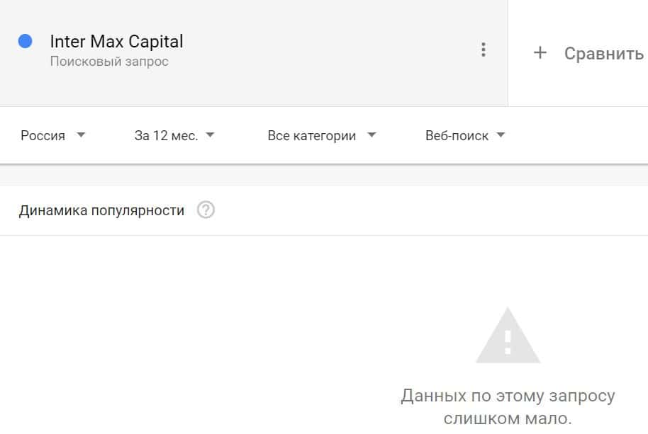 Посмотрим, насколько популярны запросы в поисковике Гугл на бренд "ИнтерМаксКапитал", написанный на русском языке. Практически такая же ситуация.
