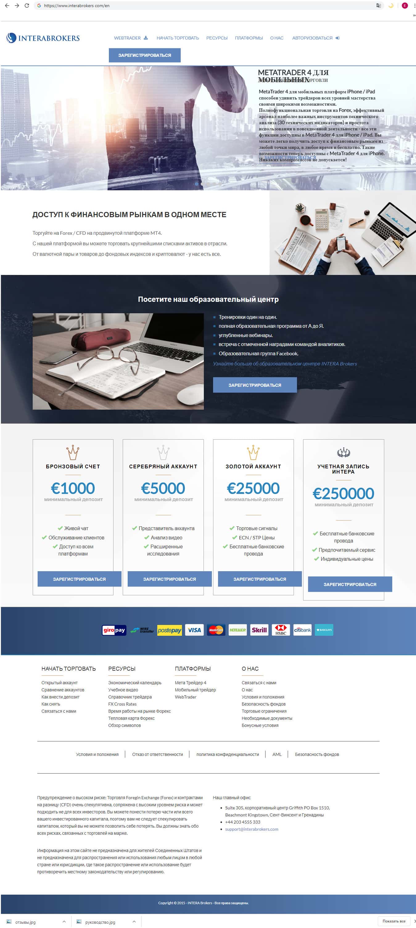 Главный сайт компании Интера Брокерс выполнен как и большинство сайтов мошенников. Об этом нам говорит куча предложений, которые сразу бросаются в глаза, и стараются завлечь. Сайт наполнен громкими слоганами, которые на самом деле являются просто пустыми словами, а существуют что бы завлечь клиента.