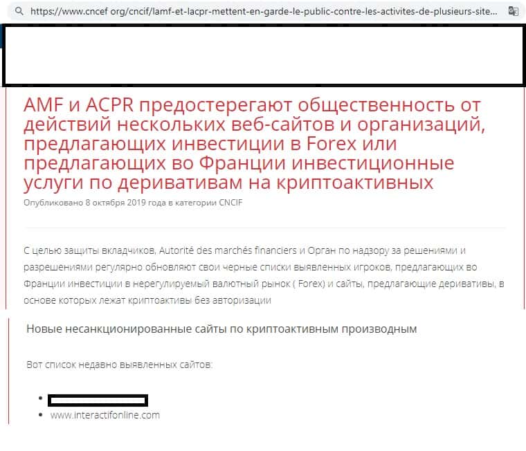 С целью защиты клиентов в сфере рыночной торговли брокерская компания InteractifOnline внесена надзорным органом во Франции в черный список несанкционированных сайтов.