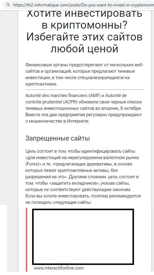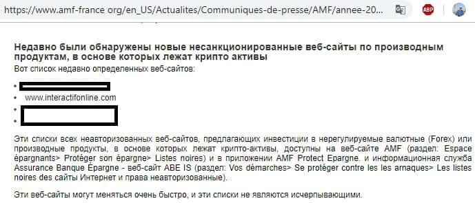 Во Франции опубликованы списки несанкционированных веб-сайтов, предлагающих инвестиции в валютные и криптовалютные рынки, в которые вошла и брокерская компания InteractifOnline.