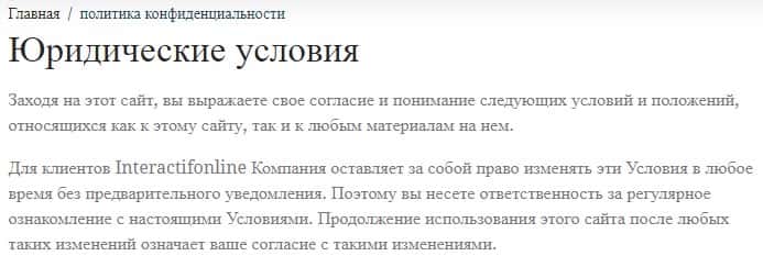 Брокерская компания Интерактив Онлайн не публикует заблаговременно на своем сайте проект клиентского соглашения, а это значит, что трейдер, приняв решение о сотрудничестве с этими жуликами, фактически купит «кота в мешке», не зная ни своих прав и обязанностей, ни ответственности сторон.