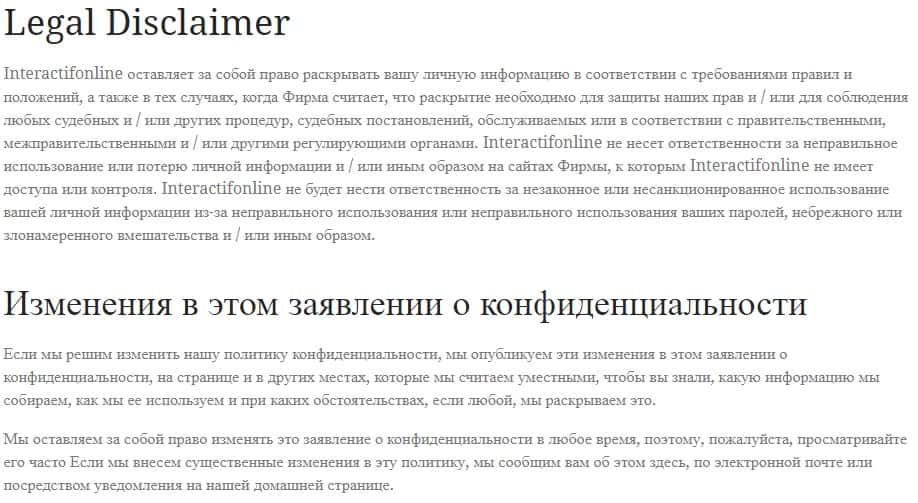 Мошенники из компании Интерактив Онлайн, якобы задекларировав политику защиты персональных данных своих клиентов, тем не менее, оставляют за собой право на ее изменение без предварительного согласия и уведомления клиентов.