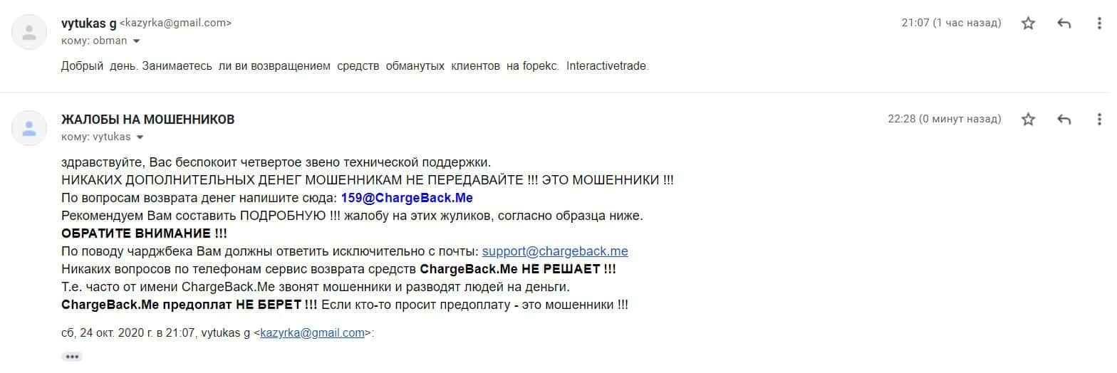 В том случае если бесстыжие мошенники Интерактив Трейд Вас обманули или пытались это сделать, то тогда сообщите е-майл чуть далее, и мы при любых обстоятельствах с Вами установим связь по электронной почте.