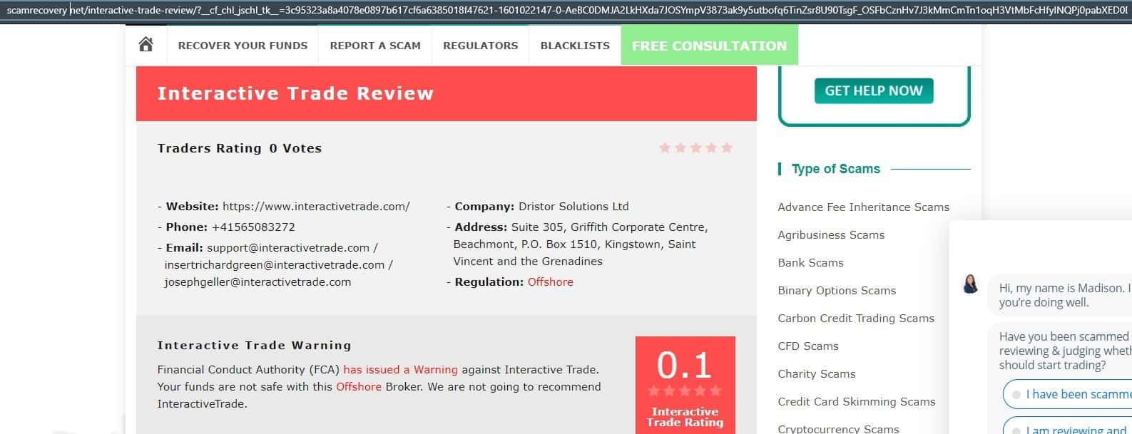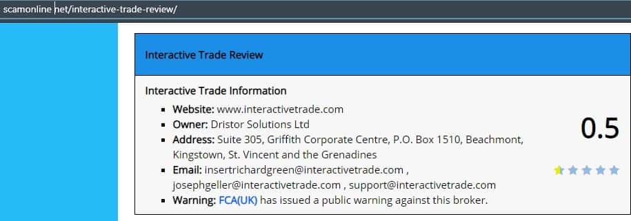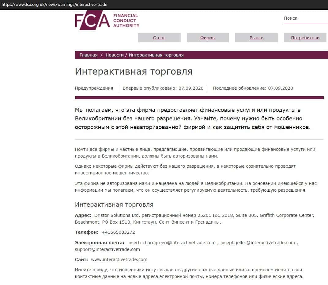 Касательно регуляции работы конторы Интерактив Трейд ничего не сказано, но все же есть упоминание на сайте регулятора FCA, где обвиняют ее в мошеннической деятельности.