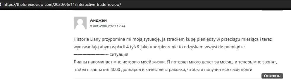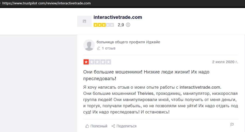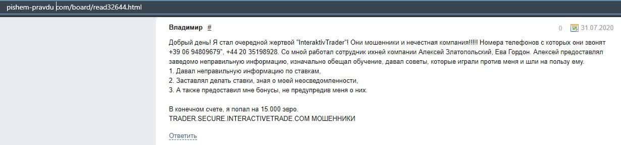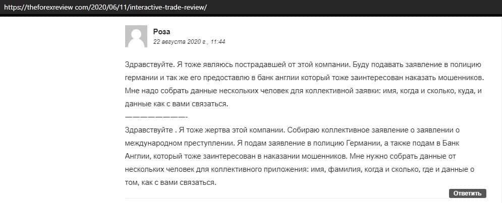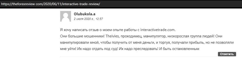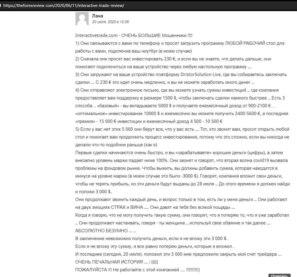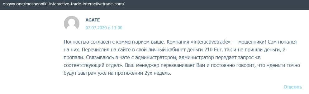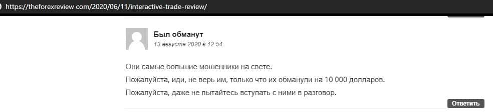 Далее представлен развернутый отзыв от человека, который сдал жертвой развода организованного конторой InteractiveTrade. Мошенники не отдают ему ни копейки.