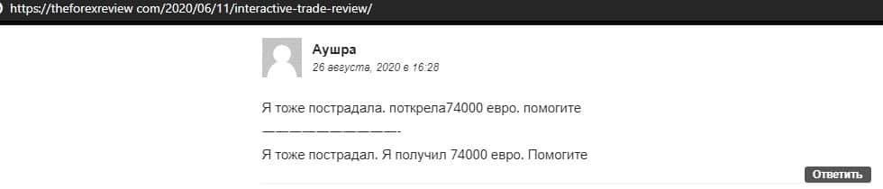 В данном отзыве автор утверждает, что мошенническая контора InteractiveTrade украла у нее порядка 74 000 евро и теперь она просит помощи в возврате утраченного.