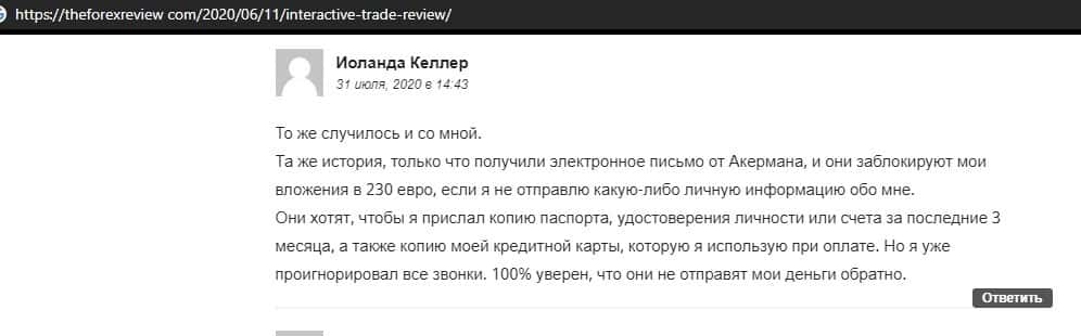 Еще один человек подтвердил, что лохотрон Интерактив Трейд предлагает клиентам внести определенную сумму денег, а после этого стали требовать документы для верификации.