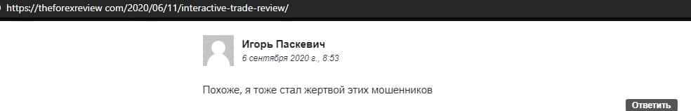 В данном отзыве человек указал, что он является пострадавшим от действий мошеннической конторы Интерактив Трейд, которая в наглую обворовала его на деньги.
