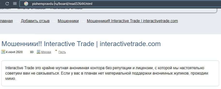 В еще одной публикации утверждается, что контора Интерактив Трейд является нерегулируемым брокером, поэтому они находятся вне закона в любой стране.