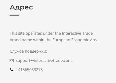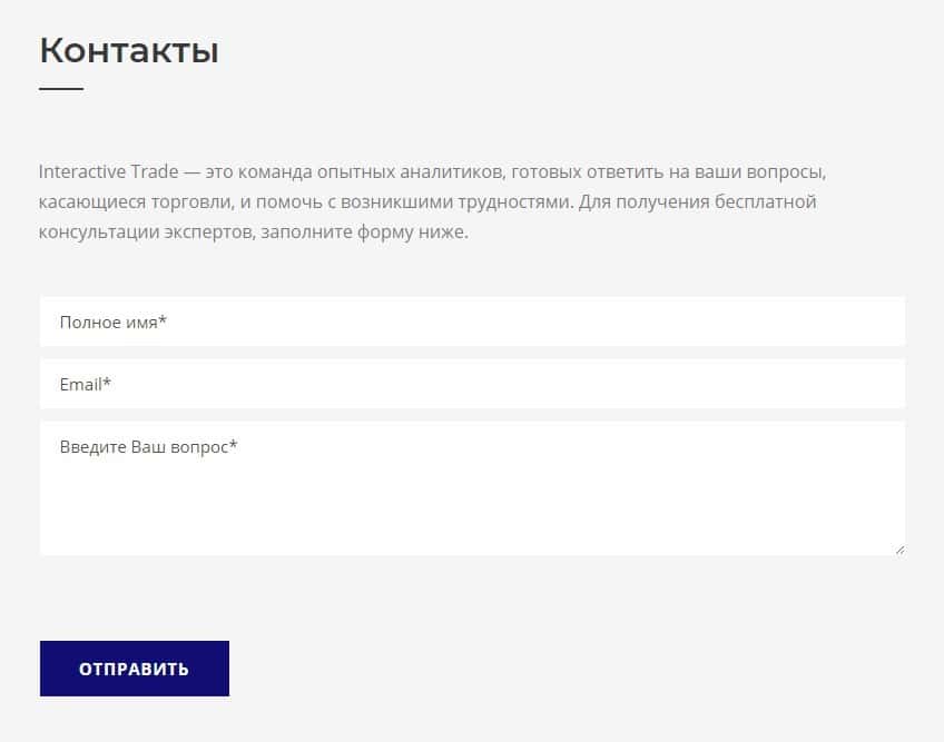 Еще лохотронская контора InteractiveTrade предлагает клиентам обратиться к ним через форму обратной связи, где нужно ввести имя и электронную почту, чего делать не советуем.