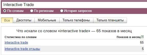Запрашиваемый бренд "Interactive Trade" в статистике Яндекс Вордстат занял около 65 показов за месяц, поэтому они не очень распространенные в сети интернет.