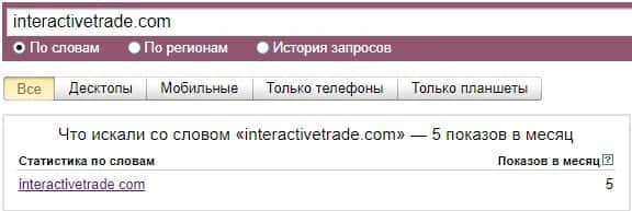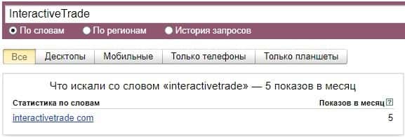 Также и ситуация и с брендом "interactivetrade com", который не очень популярен по версии Яндекс.Вордстат, потому что набрал 5 показов за месяц.