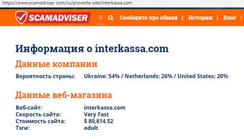 В связи с мошеннической и противозаконной деятельностью лохотрона Интеркасса его реальные руководители предпочитают анонимность дабы избежать ответственности со стороны правоохранительных органов. Информацию о самом же сайте аферистов InterKassa Com можно узнать с помощью портала scamadviser com, который вы можете увидеть на изображении, расположенном ниже.