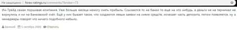 Один человек пожаловался на форуме на форекс-контору Ин Трейд. Сначала он попробовал внести немного денег и у него получилось немного вывести прибыли. Но как только он вложил 500 долларов, то аккаунт моментально заблокировали. Естественно техническая поддержка не объяснила причин блокировки счета, да и что объяснять и так понятно, мошенники.