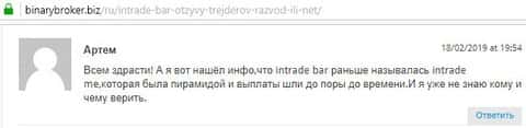 На одном интернет-ресурсе нам удалось найти отзыв одного человека, который провел свое расследование и связал мошенников конторы InTrade Bar с аферистами, которые уже соскамились под названием ИнтрейдМи. Созвучное название, и обычно так и бывает. После того как первый лохотрон сливается, мошенники на вырученные деньги организовывают новую аферу и продолжают в том же духе облапошивать клиентов. Так что есть достаточно веские подозрения по поводу данной версии и она имеет место быть.