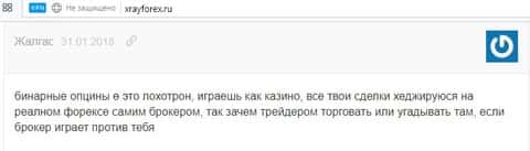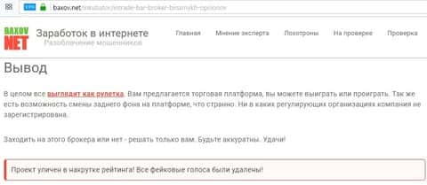 Еще есть один интернет-портал, который не повелся на удочку лохотронщиков ИнТрейд Бар. Исследователи заявляют, что данная организация выглядит как рулетка, где можно как выиграть, так и проиграть, по типу красное-черное. Регулятора нет вообще, так как этот вопрос они даже выставили на голосование. Типа зачем нам регулятор вы и так лохи нам доверяете. Тем более, что сама контора In Trade Bar уличена в накрутке рейтинга и фейковые голоса на не продажных ресурсах были удалены.