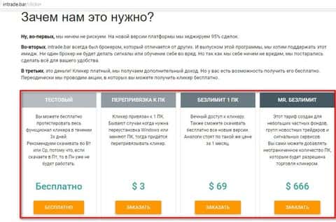 Еще один элемент сайта жуликов ИнТрейд Бар стоит упомянуть, так как в этом состоит уникальность данного лохотрона. Мошенники предлагают приобрести программу Автокликер, которая будет автоматически открывать и закрывать сделки. Вся суть основывается на привязке к новостям и шулера думают что эта штука будет работать, по крайней мере они убеждают так своих жертв. Не стоит вестись на это - ведь кнопку "Бабло" еще не придумали!