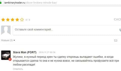Мошенники In Trade Bar, по мнению одного из интернет-пользователей, который был одним из клиентов данной кухни, высказался по поводу того, что с выполнением сделок не все так гладко как рассказывают. Задержки в терминале настолько большие, что при зависании и открытии сделки уже происходит в ненужный момент. Так что баснословные рассказы про молниеносные открытии сделок, не стоит верить, а тем более лгунам не стоит давать деньги в управление.