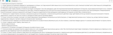 Если рассмотреть такой раздел как Ответственность Клиента и Компании, то здесь можно выделить очень отличительную особенность. По сути данный раздел должен как-то взаимно дополнять ответственность как клиента ,так и компании, но здесь в указном порядке написано, что "клиент должен", а "компания может или на свое усмотрение". Вот вся суть здесь жуликов ИнТрейд Бар и вскрывается. Весь договор направлен на финансовое порабощение жертвы, где юридически нет никакой зацепки в пользу потерпевшего.