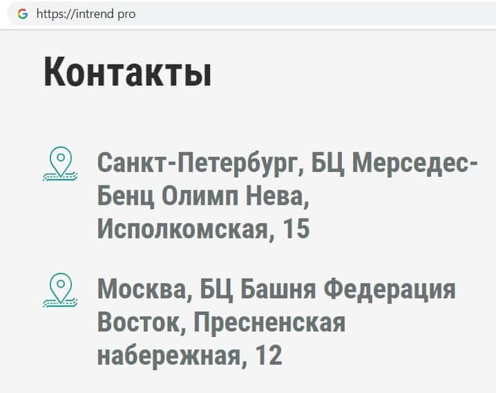 Ещё ИнТренд представил клиентам адреса, по которым якобы находятся офисы компании. но фирма снимает эти помещения и может исчезнуть в любой момент. Адреса махинаторов: