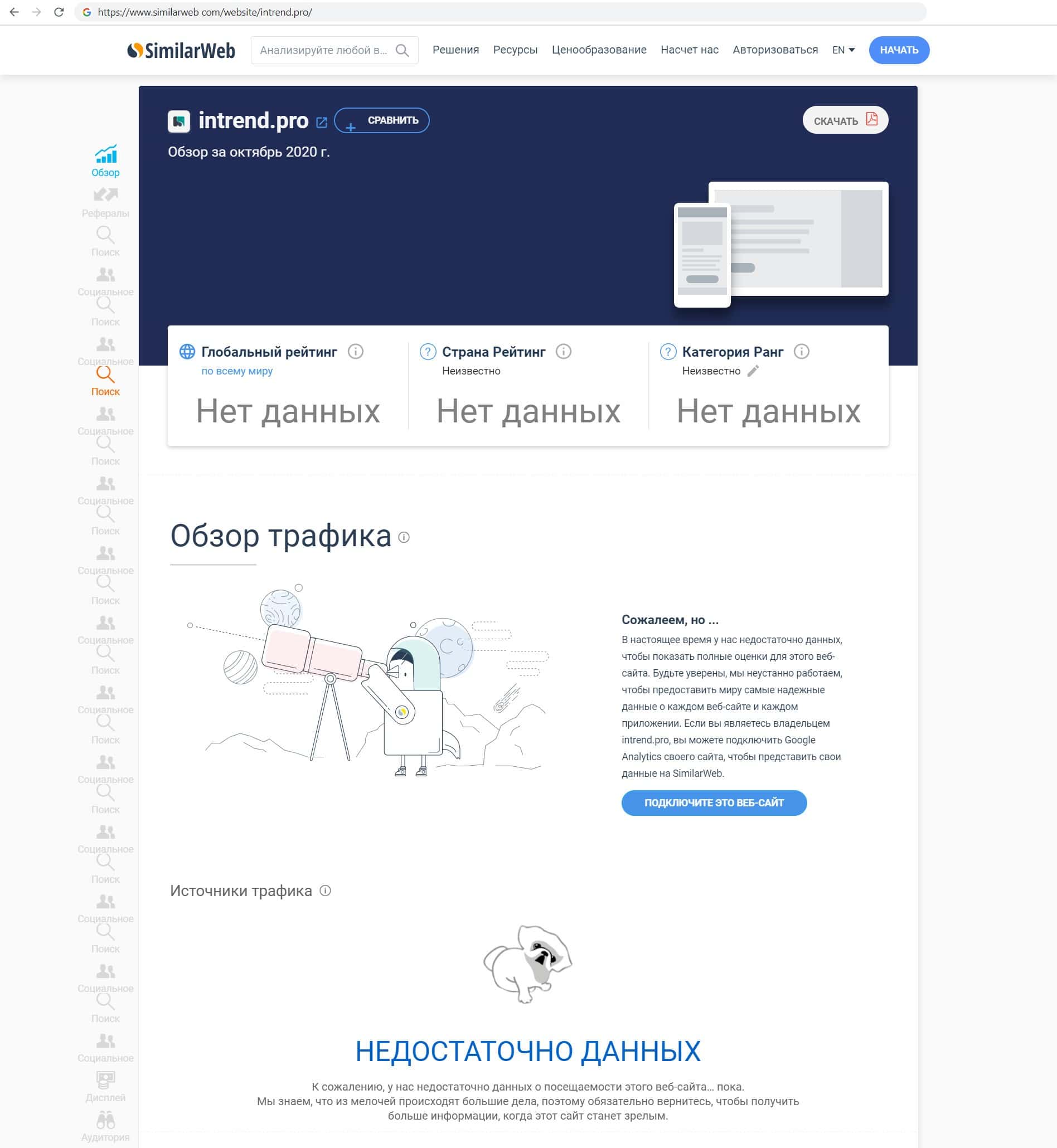 Что бы узнать информацию о трафике сайта ИнТренд мы использовали сайт similarweb com. Но оказалось, что международный сервис не обладает информацией этой конторе.