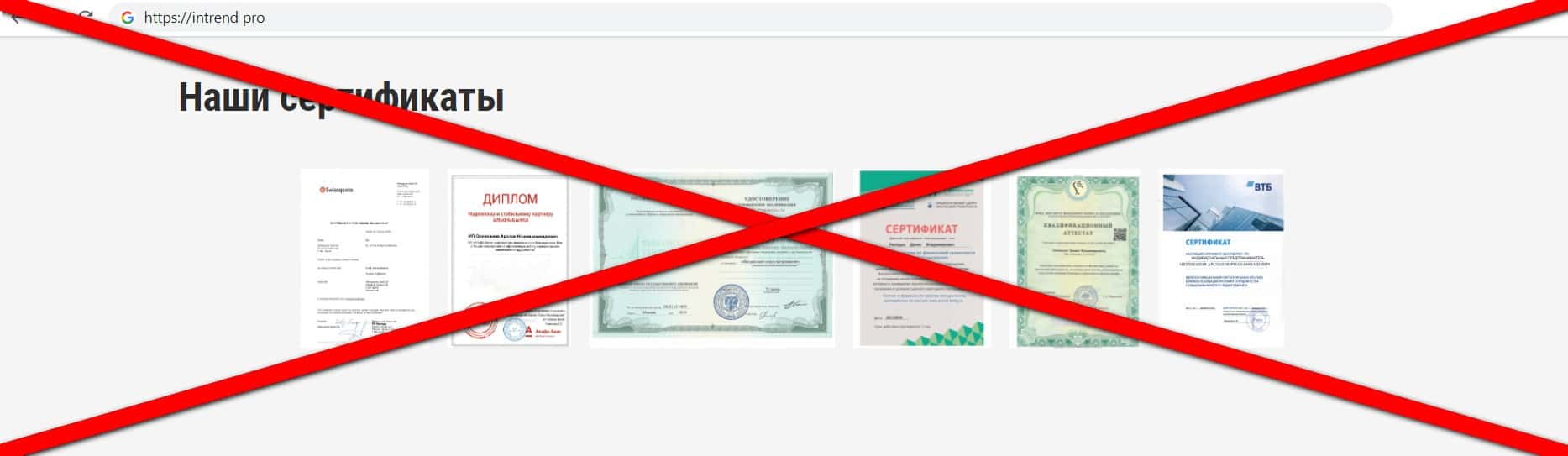 На главном интернет ресурсе компании кидал InTrend Pro есть раздел с сертификатами. Компания нарисовала какие то фальшивые сертификаты, что бы одурачить своих клиентов.