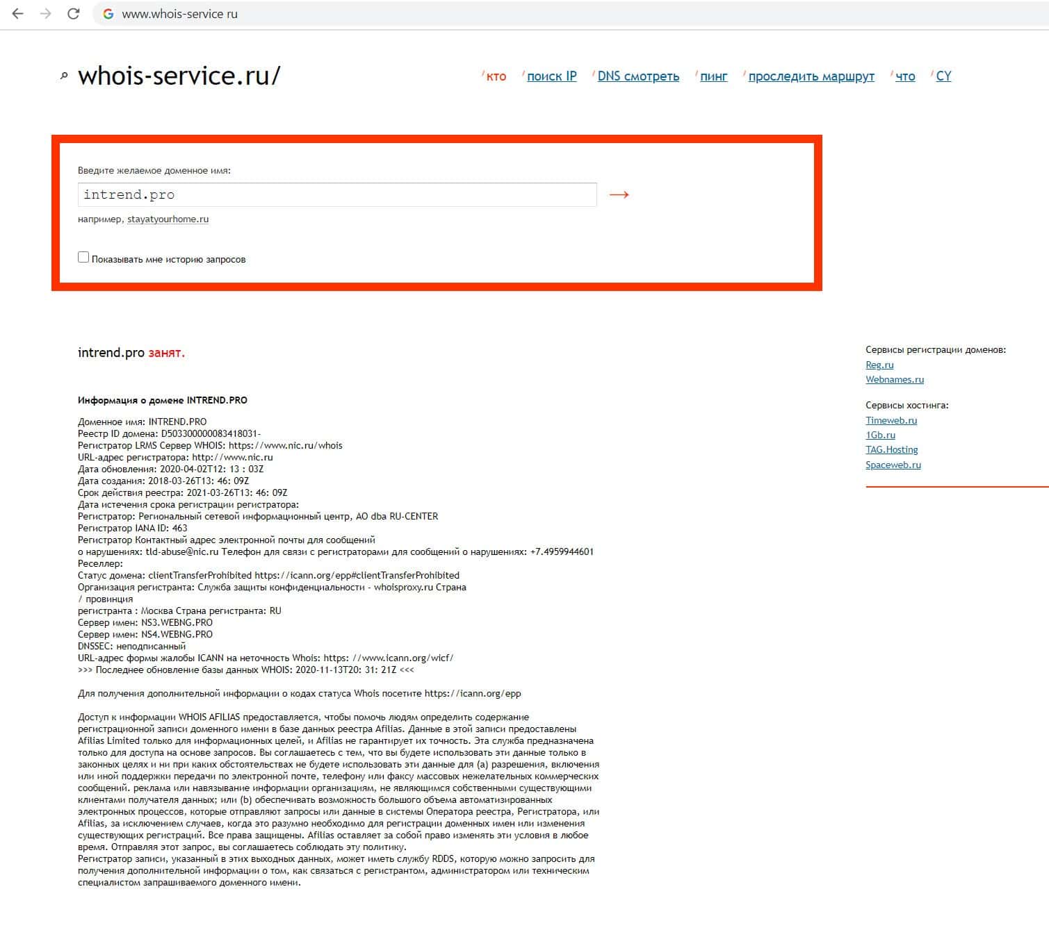 Через сайт whois-service ru мы решили узнать, кто владеет доменом компании ИнТренд. Но выяснилось, что фирма кидал ИнТренд скрывает владельца своего доменного адреса.