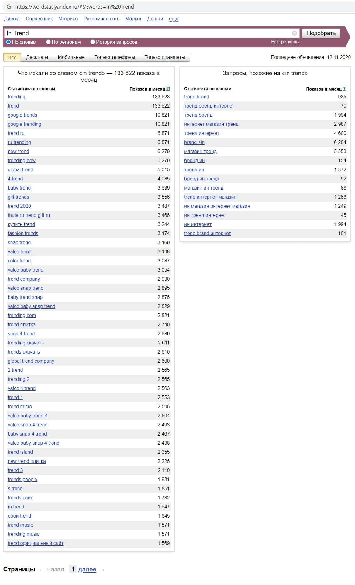 Так же мы проверили количество запросов компании InTrend Pro по названию фирмы, но с пробелом, а именно "In Trend". 133622 раза пользователи выполнили этот запрос за месяц.