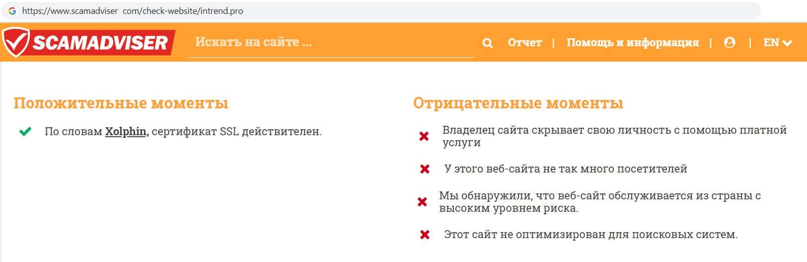 Мнение интернет ресурса scamadviser com о конторе разводил InTrend Pro