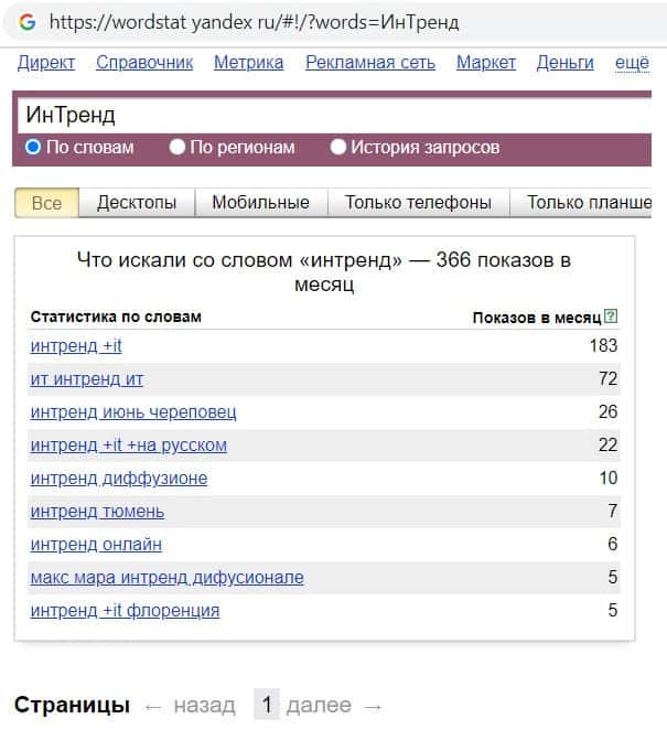 Далее мы проверили количество запросов конторы кидал InTrend Pro по русскоязычному названию, а именно "ИнТренд". Данный запрос пользователи совершили 366 раз за месяц.